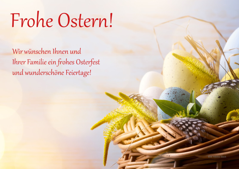 Wir wünschen Ihnen und Ihren Familien ein wunderschönes Osterfest, erholsame Feiertage und sonnige Frühlingsmomente! Genießen Sie die Zeit im Kreise Ihrer Familie!